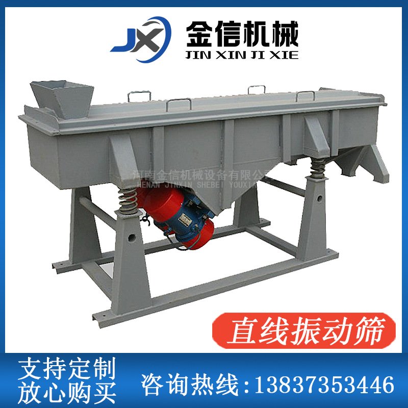 直线振动筛利用振动机激振作为振动动力来源,使物料在 筛网上被抛起,用时向前作直线运动、物料从给料机均匀地进入 筛分机的进料口通过多层筛网立生数种规格的筛上物、筛下物 分别从各自的出口排出具有耗能低、产量高、结构简单、易 维修、全封闭结构,无粉工溢散,自动排料,更适合于流水线作业