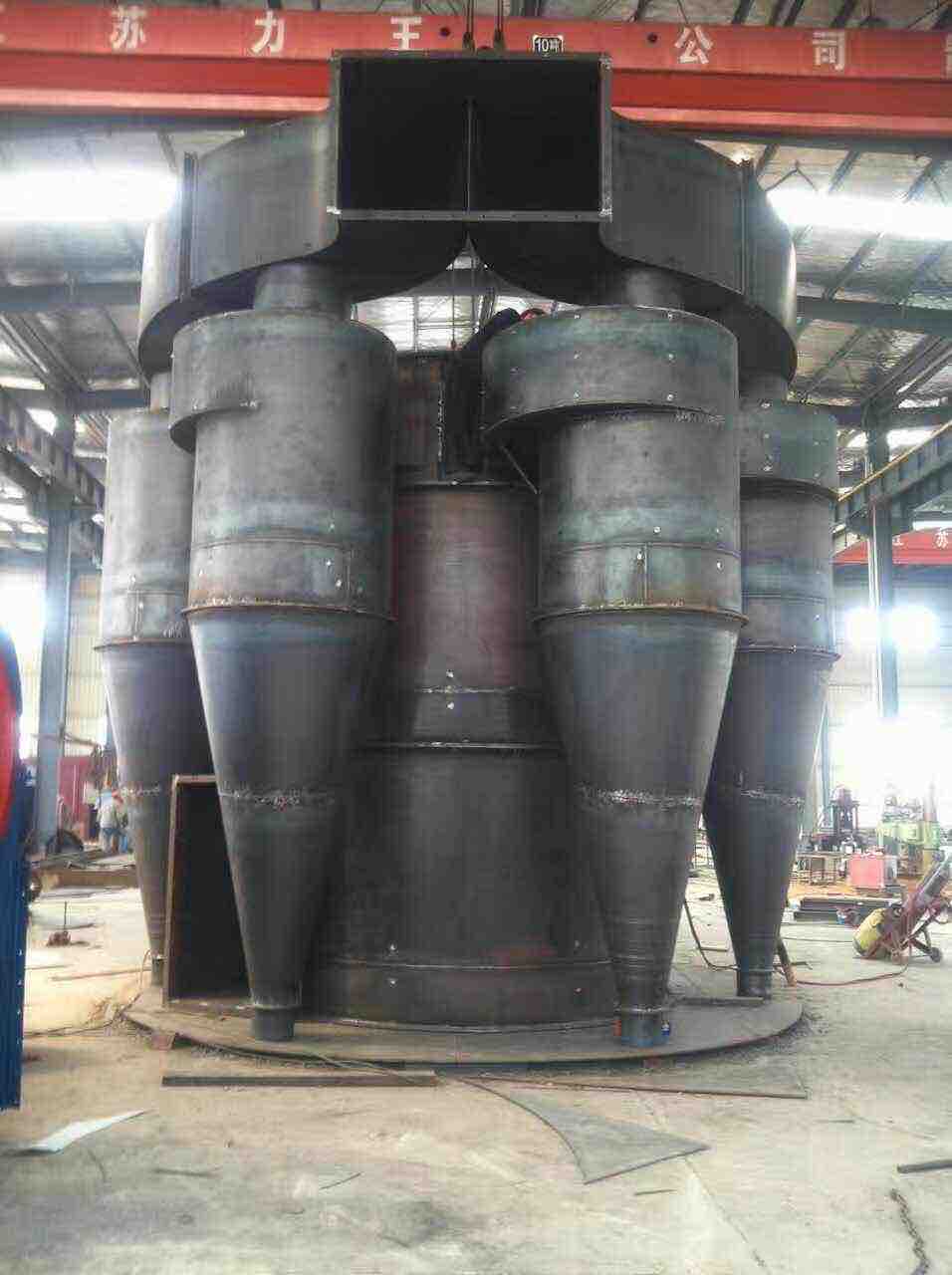 4、经上笼形转子离心加速后的颗粒随循环风进入外部各个旋风筒内,由于新设计的旋风筒在进风口蜗牛角处加设了导风板,在旋风筒套筒下端增设了调速板,使旋风筒的流体阻力下降,循环风在导风板作用下,以较高的风速进入旋风筒中,由于蜗牛角部分扩大,故风速突然减低,加速颗粒沉降、提高旋风筒的收尘效率 。粉含量。