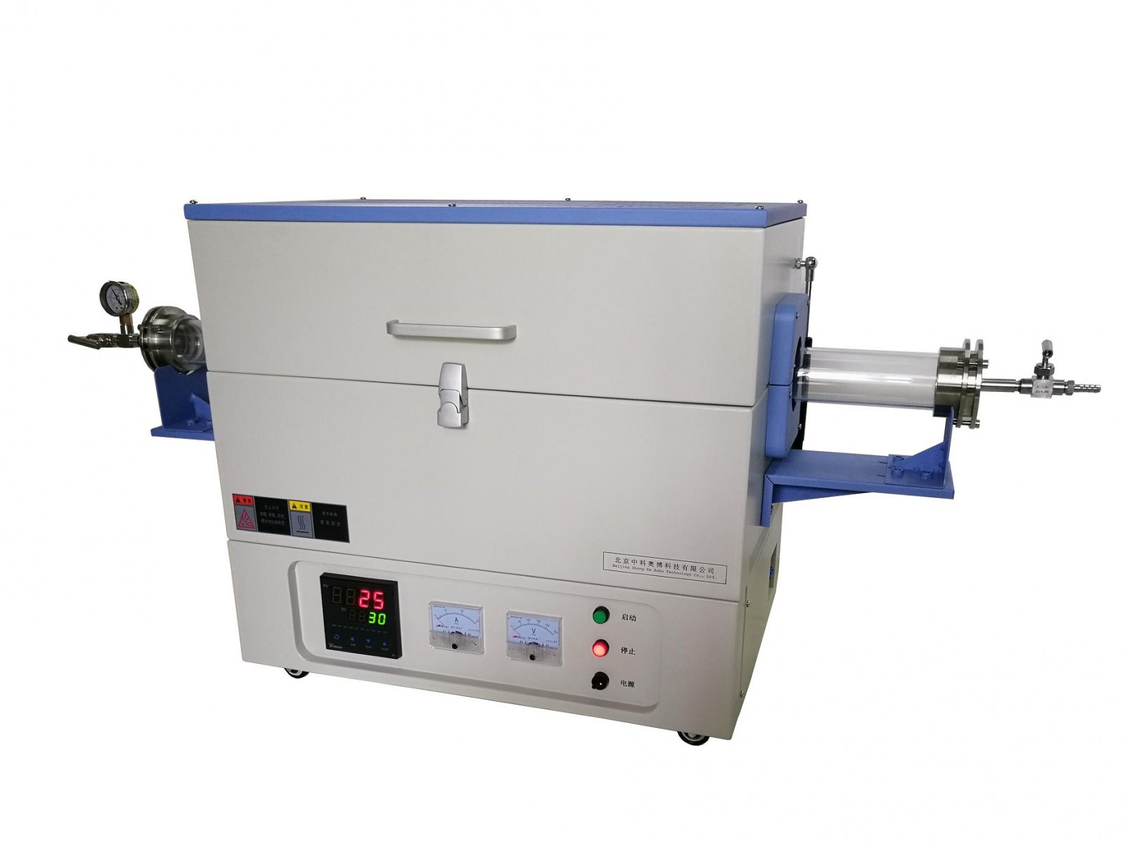 5. 完善的气路装置,具有进出气微量可调功能,管内压力有仪表显示,一目了然,采用可靠的多环密封技术,提高了炉管两端的气密性。快速连接法兰方便操作。