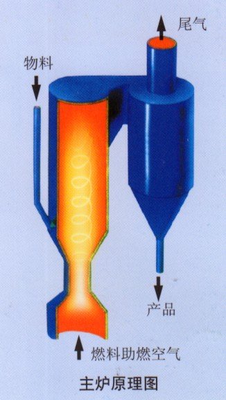闪烁沸腾煅烧炉主要由介质加热系统、加料系统、气固体混合装置、煅烧炉、气固分离收集装置组成。预煅烧物料经加料系统由气固混合器送入炉内,同加热系统加热的热介质混合后呈旋流状流态化运动,煅烧过程在瞬间完成后,进入气固分离器,分离后的固体与气体分别从排料口和排风口排出。