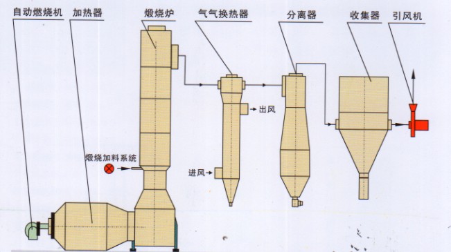 通常采用系统引风装置,系统处于负压状态;用直接或间接方式获得热介质,煅烧尾气采用冷却,旋风分离,袋式过游器进行空气净化和产品回收。