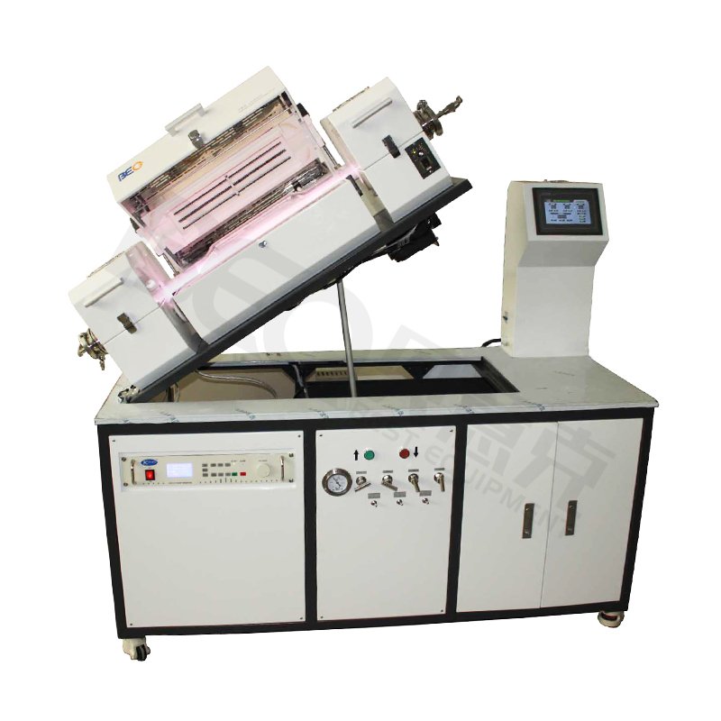 该款设备选用特殊形状(两头细中间粗)的石英管作为化学气相沉积的反应室;加热的同时炉管可360度旋转,管内壁有石英挡片帮助粉体材料翻炒有助于烧结得更均匀;而且炉体可左右大角度倾斜,方便进出料,倾斜角度在0~35°可调。