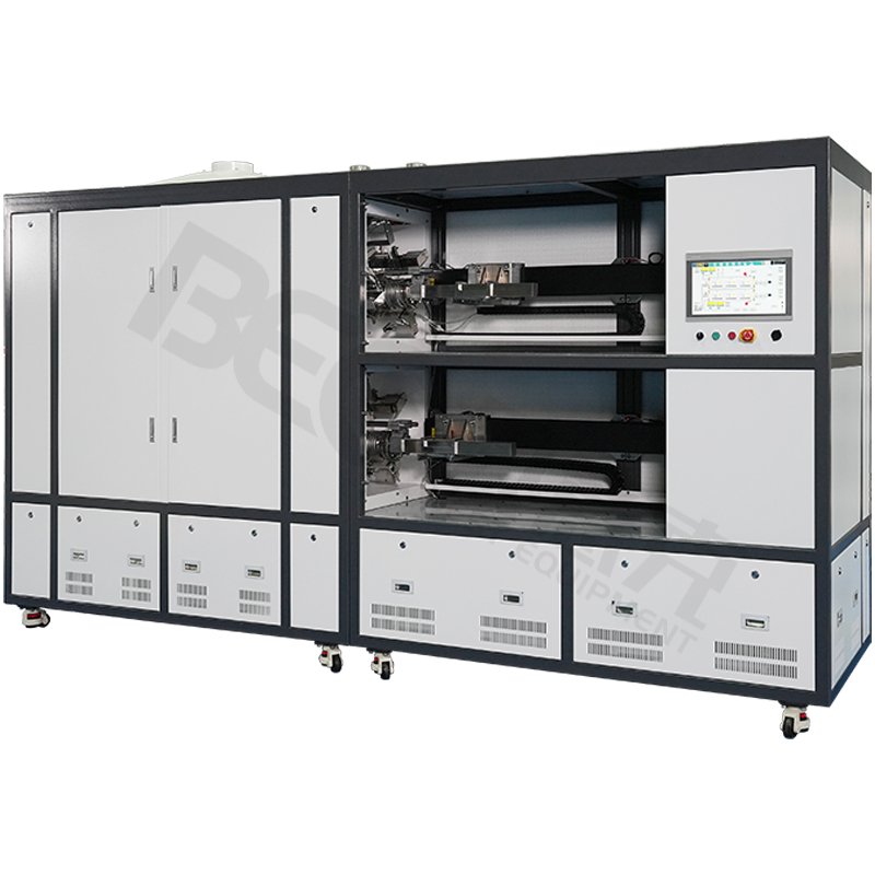 全自动气氛退火管式炉拥有自动送料、自动锁紧法兰密封功能,材料载具采用碳化硅—一种耐高压、耐高温、抗辐照优良半导体材料,当材料放入载具后可通过电动滑块模组送入石英管腔体内,此时法兰周边的回转气缸自动锁紧。加热腔体采用氧化铝纤维制品,其极低的热导率和比热容,保证了炉膛的快速升温和低蓄热,加热元件选用电阻丝加热,有利于炉内温度场的均匀分布。控温仪表选用智能型程序温度调节仪表控温,采用智能PID控制,30段可编程程序,可曲线升温并设定温度速率,恒温时间控制,自动停机等,具有超温报警、漏电保护、过温保护等功能。此设备还配备了触摸屏,实现物料从送料-法兰密封-抽真空-升温烧结-退火集成一体智能化控制。另外,此设备右边送料区域背板装置了空气过滤器,达到一定的净化空气的作用,使材料出腔体时不受空气中粉尘杂质的影响。
