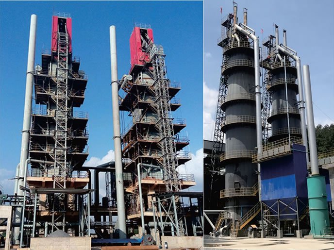 双梁窑的煅烧机理为全程逆流煅烧。双梁窑的核心部分是采用两层烧嘴梁,梁内有若干燃料管将燃料供给烧嘴,烧嘴分布在梁的两侧,将燃料均匀地分布在窑的断面上,保证了在整个竖窑断面上均匀燃烧。燃烧梁采用导热油冷却,导热油带出的热呈用于预热燃烧用一次空气,使窑的热耗有所降低。双梁窑的主要优点是耐火材料砖型及砌筑简单,在三种竖窑中耐火材料重量*轻。双梁窑采用了双向压力系统(**开发的为三路压力系统), 煅烧带以下为正压,煅烧带以上为负压。燃烧所需的二次空气由鼓风机鼓入冷却带,使窑内煅烧带以下保持正压;窑上部的废气通过引风机抽出,使窑内煅烧带以上保持负压。所谓三路压力系统,是指在下层烧嘴梁以下2000mm处新增了抽气梁,抽气梁后面接高温风机将约500℃的热空气(石灰冷却空气冷却石灰后变成的热空气)抽出送到烧嘴梁,这样在下层烧嘴梁与抽气梁之间形成第三路DD零压,在这个区域基本无气流流动。双梁窑使用的燃料亦为流体燃料,如煤气、油、煤粉等。比较而言,双梁窑的主要缺点是煅烧原理落后,石灰活性度不高。国内几家投产的双梁窑石灰活性度均较低。甚至与普通气烧竖窑差不多,因此也限制了双梁窑的推广。
