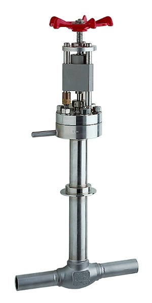 产品是304L不锈钢制的手动截止阀,入口在顶部,带加长螺栓式阀盖。阀体连接端是对焊式。一体化阀座和可重复使用的软密封片确保通过气泡紧闭实验。在阀杆的上部分特别设计了一个圆盘以便可以和真空夹套焊接。