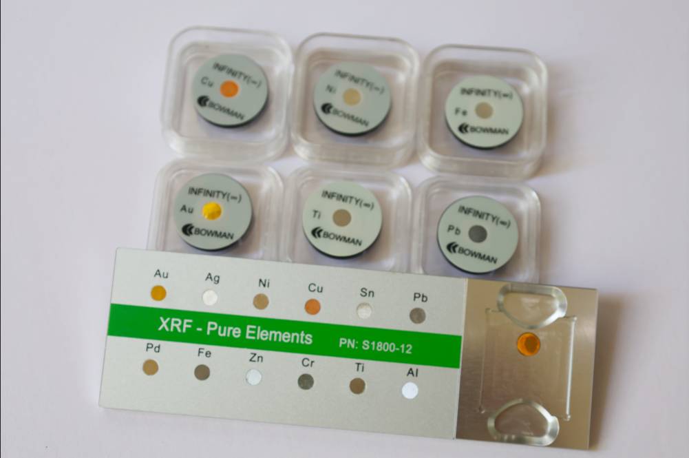 博曼(BOWMAN)测厚仪的12合1标准片,XRF-Pure Elements,是一种组合式镀层厚度校准标准件,即X-Ray荧光测厚仪标准片,满足了广大用户全方面需求,元素分别有:Au金,Ag银,Ni镍,Cu铜,Sn锡,Pb铅,Pd钯,Fe铁,Zn锌,Cr铬,Ti钛,Al铝,多样化包含12种不同厚度的镀层,用于对X射线荧光测厚仪等设备进行标准化校准、验证仪器精度及建立标准曲线。