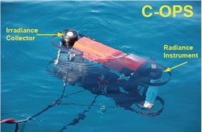 C-OPS是一款用于研究海洋光学特性的辐射测量系统。它由两部个辐射计组成:其中一个测量水体上行辐亮度,另一个测量下行辐照度或上行辐照度。两部辐射计都有19个波段并被安装在可以自由下落的框架上。框架可以进行优化调节,使之在加较浅的近海岸水体中以较低的速率沉降,而在较深的开阔洋面以较高的速率沉降。可选的配件包括:测量水上入射辐照度的参比辐照度传感器;BioShade,用于测量漫射的影带组件;BioGPS,提供坐标和时间的部件。