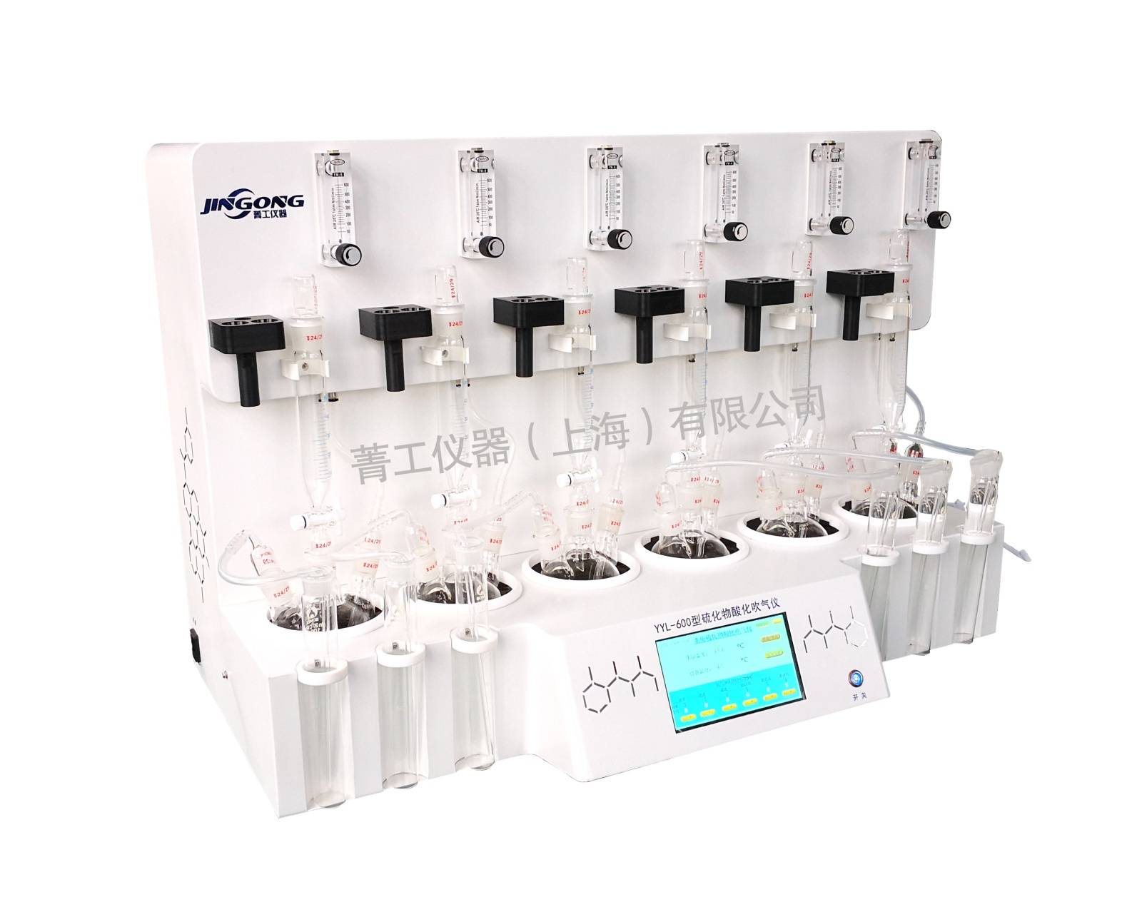 JL -600型水质硫化物酸化吹气仪采用恒温水浴加热,PID精确控温;具有快速自动恒温控制系统,缩短分析时间。盐酸入口、气体进口、出口三口一体且相互独立,操作互不干扰。可取放反应瓶托架,耐强酸碱腐蚀、耐高温,配比样品方便简洁。水浴系统智能自动进、出水,开机能够自动识别,缺水报警并自动加液的功能,大容量反应瓶,独立的六单元模块,可同时处理六个样品。每个样品的氮气流量独立控制,双安全阀保护,确保实验安全有效进行,高稳定性彩色触摸屏,参数指令全屏显示,操作简洁直观。氮气恒定吹扫,内部气密性实时侦测,气源时间定时控制,达到设定时间自动关闭气源,仪器外观选用耐腐蚀材质,具有良好的化学反应稳定性和热稳定性,寿命长特点。