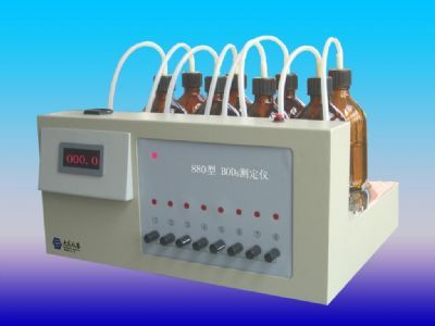 880型数字式BOD5测定仪采用空气压差法原理设计而成,当被测样品在20±1℃条件下恒温进行五日培养后,经过生物氧化作用,有机物转变成氮、碳和硫的氧化物,并产生二氧化碳气体被氢氧化钠吸收,培养瓶内压力减少,通过压力传感器将变化量转为电信号,从而可以检测出被测样品BOD5的值。