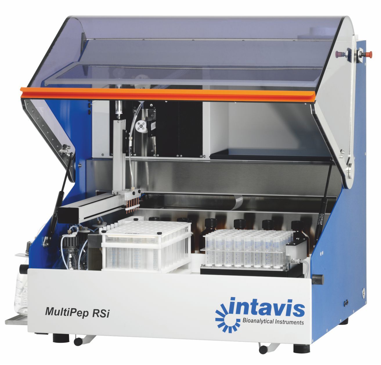 MultiPep RSi针对研究级多肽合成开发。通过不同配置满足从1μmol到25-100μmol的合成需求。多肽序列、溶液和试剂的用量以及合成参数都可以通过针对不同的合成级别调整。合成可以在一次性合成板或者合成柱上进行,便于工作和清洗。氨基酸可以在独立的激活管内在线预激活。反应液通过真空泵抽离。每次合成循环后,都可以通过一套多通道清洗针进行快速清洗。所有的配置更换简单,可以通过相同的软件设定来适合不同的配置。