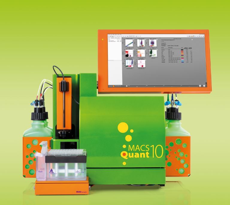 MACSQuant®仪器是一款新型的、体积小巧的三激光台式流式细胞仪,用于自动多色流式细胞分析。MACSQuant®流式细胞仪配备有两个散射光(前向角散射光FSC和侧向角散射光SSC)和多达8个荧光通道,加上功能强大的软件,使得该机器可以进行快速简便的细胞分析。