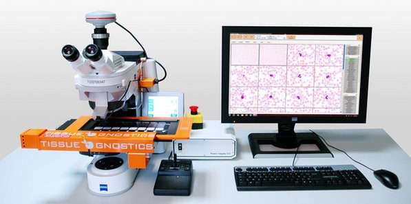 HemoFAXS 细胞获取和分类过程建立在**自动识别在**扫描范围内的楔形血液涂片中。然后利用 10 倍目镜扫描检索 MGG 或者被染色的白细胞,并且储存每个白细胞的 x/y 数据。白细胞的影相被放大 100 倍,即刻应用 Support Vetor Machine 进行分类以便用户进行观察。