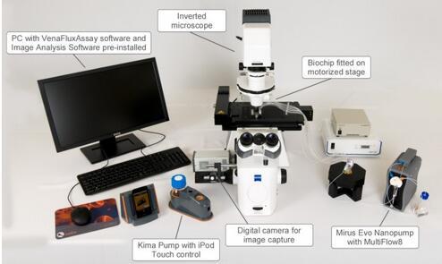 VenaFlux 系统是**个能进行连续流体细胞分析的半自动化微流体分析系统。配合使用Cellix生物芯片和细胞分析软件,VenaFlux 系统可检测粘附到微毛细管上的细胞,微毛细管中覆盖抗体或者培养有内皮细胞,模拟生理流动产生一定的剪切力。