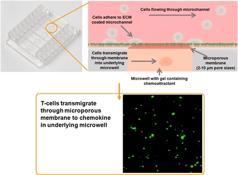 Transmigration Assays: Cells flowing through the microcapillary of the biochip may attach to the cell monolayer on the membrane and transmigrate through the cell monolayer and membrane towards the chemokine in the underlying microwell.