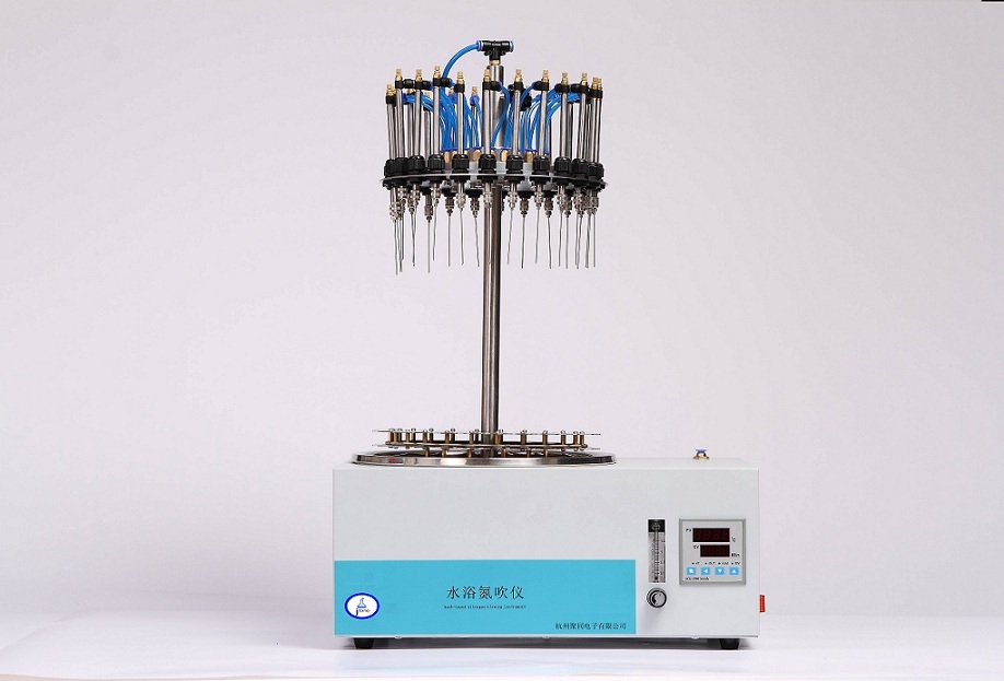 氮吹仪将氮气快速、连续、可控地吹到加热样品表面,实现大量样品的快速浓缩。通过将氮气吹入样品,加强周围的空气流动和升高温度可以使样品中的溶剂快速蒸发。氮气是一种惰性气体,能起到隔绝空气的作用,防止氧化。氮吹仪利用氮气的快速流动打破液体上空的气液平衡,从而使液体挥发速度加快;并通过干式加热或水浴加热方式升高温度(目标物的沸点一般比溶剂的要高一些),从而达到样品无氧浓缩的目的,保持样品更纯净。使用氮吹仪代替常用的旋转蒸发仪进行浓缩,能同时浓缩几十个样品,使样品制备时间大为缩短,并且具有省时,易操作,快捷的特点。