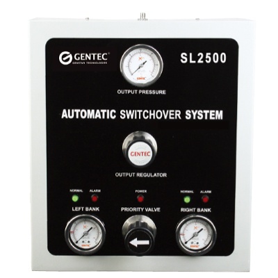 SL2500 系列自动切换柜可接左右两侧气源自动切换供气,提供不间断气源。当自动切换完成以后,需反向旋转手轮,使箭头指向正在供气侧,以完成下一次的自动切换。外接报警器,监视气瓶使用状况,当压力下降至设定报警压力时,将声光提示更换气瓶。