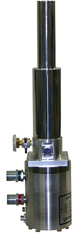 The above picture shows a cryocooler with no vacuum shroud or radiation shield. A bulkhead with 2 SMA connectors are shown. This has the upgrade instrumentation skirt. | The above picture shows the vacuum shroud and radiation shield for the cryostat. |