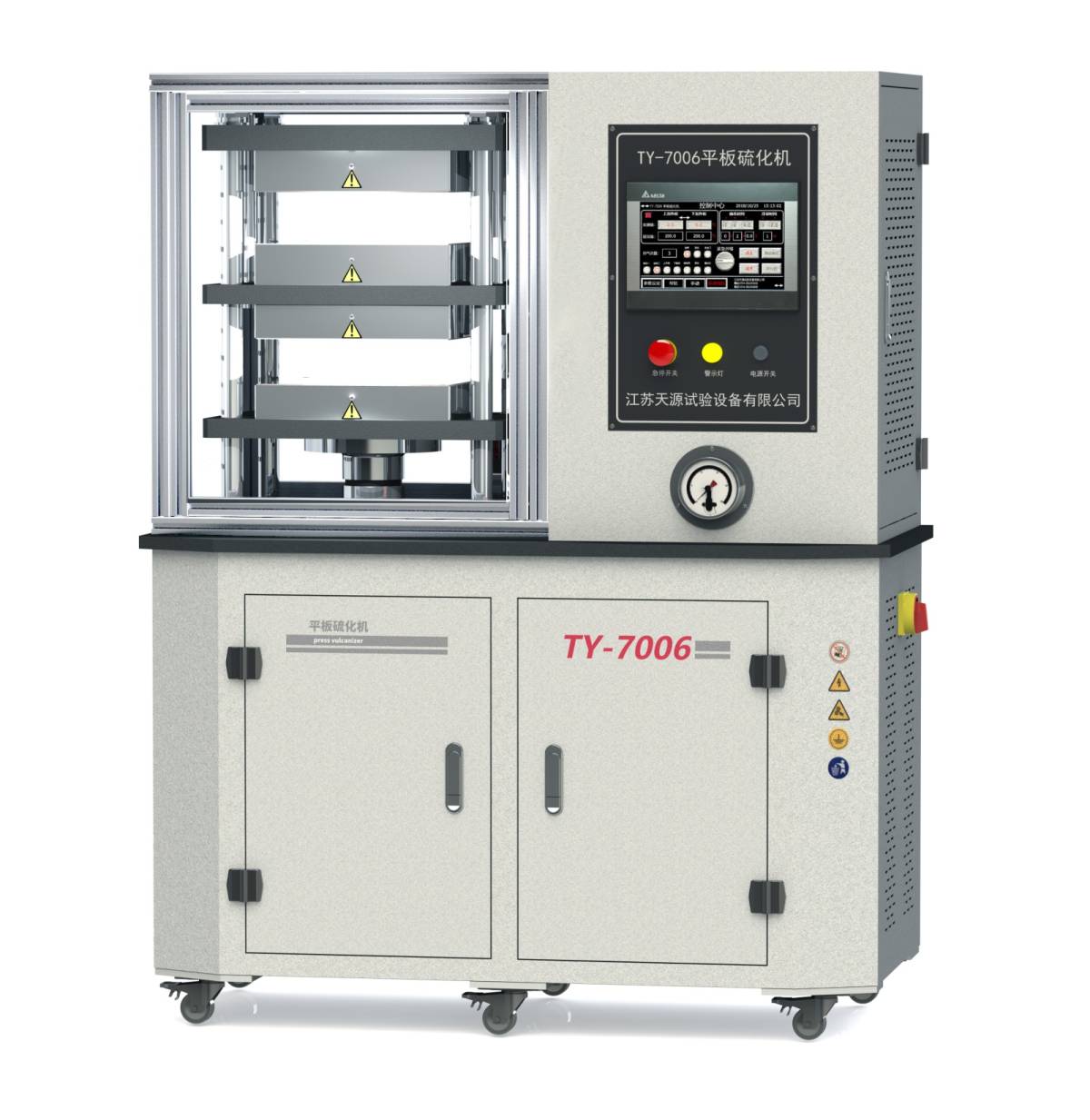 TY-7006平板硫化机装有PLC程式控制彩色触摸屏,人机界面操作系统,可设定压力、温度、时间和排气次数,硫化过程显示及监控,所设模压程式全自动完成。