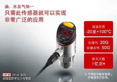 基恩士GP-M系列超强型数字压力传感器全新登场!油、水及气体只需此传感器就可以实现广泛的应用,让设备改善中的压力管理如虎添翼。该系列产品清楚易懂、坚固耐用,在汽车金属加工、树脂成型、食品药品、半导体、电气等领域均有广泛的应用,帮助客户通过压力管理实现各类项目品质改善的目的。