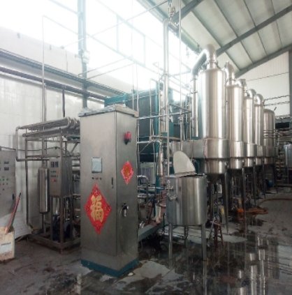 三效蒸发器主要由相互串联的三姐蒸发器、冷凝器、盐分离器和辅助设备等组成,三姐蒸发器以串联的形式运行,组成三效蒸发器。整春蒸发系统采用连续进料、连续出料的生产方式。物料首先进入一效蒸发器,蒸发器配有循坏泵,将物料打入蒸发换热室,在蒸发换热室内,外接燕气液化产生汽化潜热,对物料进行加热。由于蒸发换热室内压力较大,物料在蒸发换热室中在高于正常液休沸点压力下加热至过热。加热后的液体进入蒸发室后,物料的压力迅速下降导致部分物料闪蒸,或迅速沸膊。物料蒸发后的蒸气进入二效强制循环蒸发器作为动力蒸气,对二效蒸发器进行加热,未蒸发物料暂存在蒸发室。物料依次经过一一二效一三效依次流动,物料不断地被蒸发,物料中盐的浓度越来越高,当物料中的盐分超过饱和状态时,水中盐分就会不断地析出,进入蒸发结晶室的下部的集盐室(盐腿)。出料不断将合盐的物料送至稠厚器,进一步增稠,澄清液通过溢流口流入母波援。稠厚解底部沉淀的结晶盐流入高心机中,高心脱水得到固体湿盐,滤液流入母液罐中,通过母液泵大部分输送回三效蒸发器中;系统运行过程中,部分高沸点母液不断累计,造成溶波沸点温升不断升高,为避免高沸点物质累积影响系统烈发量,所以运行过程中需排除部分母液。