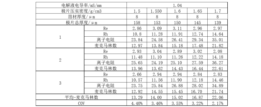 结论:随着压实密度的增大,负极极片的麦克马林数增大,说明迂曲度变大;从COV上可以看到,测试的极片COV均小于5%,说明测试一致性较好。