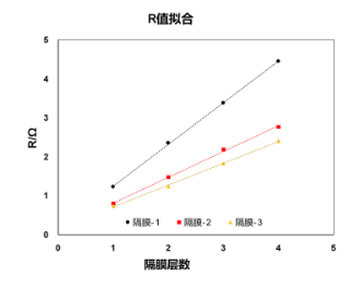 将隔膜组装成不同层数的样品,电极采用不锈钢做电极,随后测试EIS变化,得到不同层数的隔膜电阻,计算隔膜离子电导率。