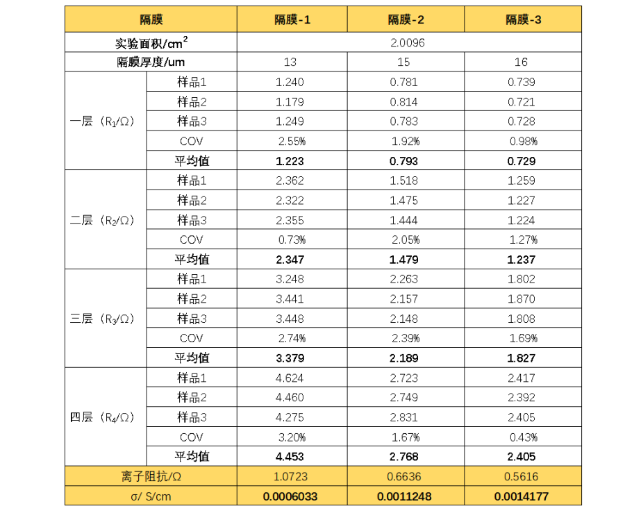 其中,R为测试离子电阻,A为有效反应面积, σ为离子电导率, d为隔膜厚度。