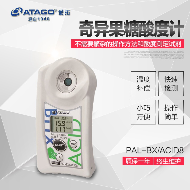 为了方便更多的农业、水果行业的客户快速检测糖酸比,提供更高的测量服务和更低的价格。让跟多的农业和水果行业客户认识到不仅仅需要检测糖度,还需要检测酸度,*合适的糖酸比才是评价水果的ZUI好指标。ATAGO(爱拓)研发了这款新的糖酸一体机,不仅可以同时检测水果的糖酸比,而且不需要繁杂的操作方法和酸度测定试剂。PAL-BX/ACID 8(奇异果)糖酸一体机,奇异果糖酸比检测仪,奇异果糖酸度计,专门设计为测量奇异果糖酸度,带有OFFSET曲线修正功能,可用于对比修正滴定法结果或者其他读数单位产生的数值偏差,使测试结果同步一致。可以用来测量奇异果及奇异果制品的糖度和酸度含量。