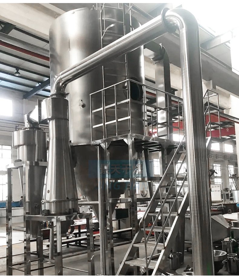 空气经过过滤和加热,进入干燥器顶部空气分配器,热空气呈螺旋状均匀地进入干燥室。料液经塔体顶部的高速离心雾化器,(旋转)喷雾成极细微的雾状液珠,与热空气并流接触,在极短的时间内可干燥为成品。成品连续地由干燥塔底部和旋风分离器中输出,废气由风机排空。