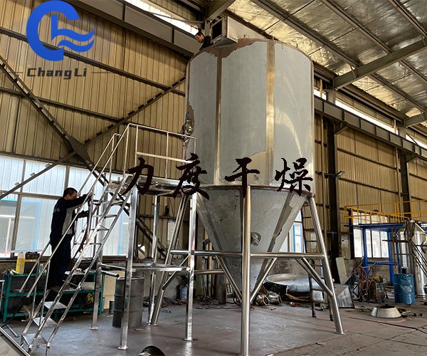 空气通过过滤器和加热装置后,进入干燥室顶部的进风分配器,通过进风分配器的热空气呈螺旋状均匀地进入塔内,同时由螺杆泵将料液送到装在塔体顶部的离心喷雾头,料液被雾化成极小的雾状液滴,使料液和热空气接触的表面积大大增加,小液滴和热风并流下沉,水份迅速蒸发在极短的时间内被干燥为粉粒制品,在塔底和旋风分离器中捕集,废气排至外界。