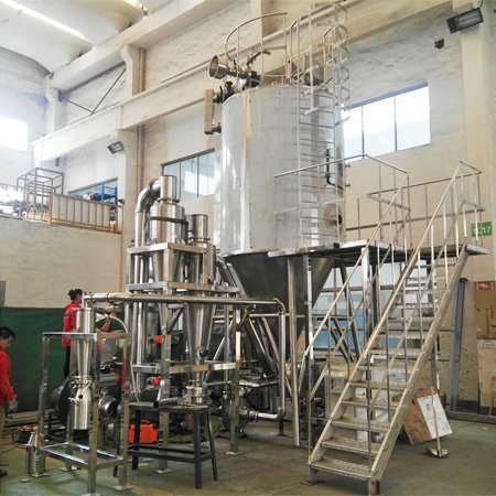 中药浸膏是由植物根茎叶提取而成,特别是醇提工艺,它含糖份较高,在高温下易软化熔融,普通的离心喷雾已无法满足干燥,针对这种情况我公司组织了一批精干的技术力量,总结出几年来本厂设计制造喷雾干燥机的成功经验,收集了国内外同行业同类型产品的优点,经过精密、反复的工艺计算和无数次的实验,开发出了中药专用喷雾干燥机组,并推广到了一些知名药厂使用。