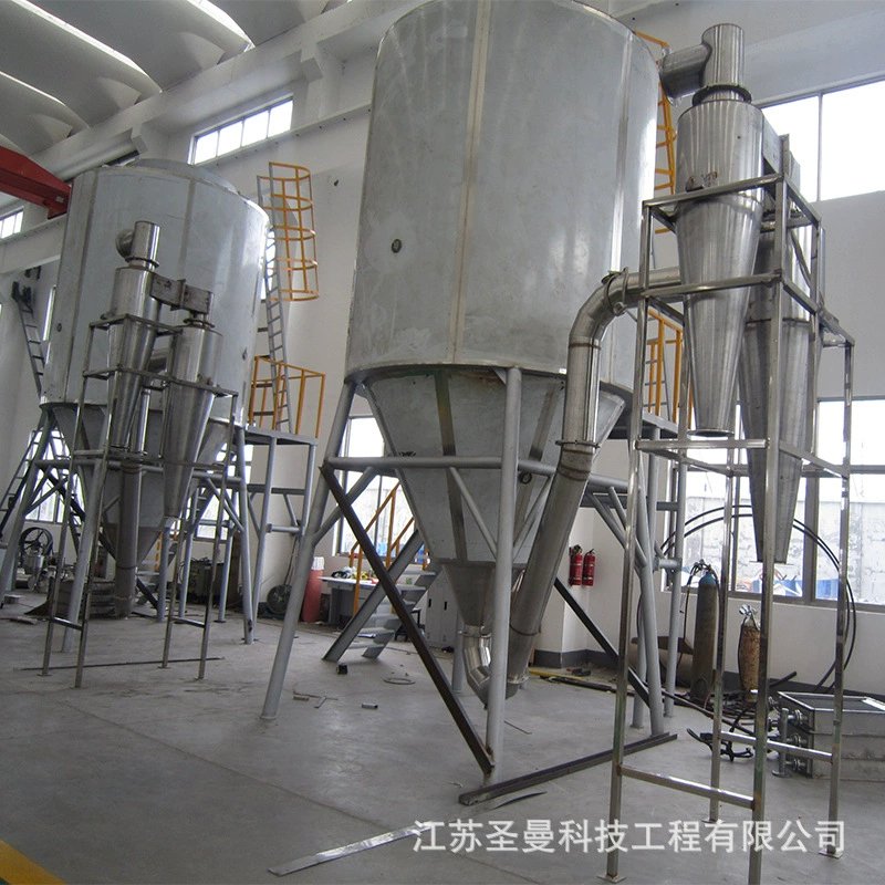 喷雾干燥机是空气经过滤和加热,进入干燥器顶部空气分配器,热空气呈螺旋状均匀地进入干燥室。料液经双隔膜泵被送至干燥塔顶部的高速离心雾化器中,在离心力的作用下,物料被雾化成液滴雾群,与热空气对流接触后,使水分蒸发而干燥成粉。干燥的产品从干燥塔的旋风排出,经冷却风送旋风分离一收粉,旋风分离器分离排出的尾气及少量细粉经引风机引入水膜除尘,尾气中少量细粉在水膜除尘中充分吸收后达标排出。