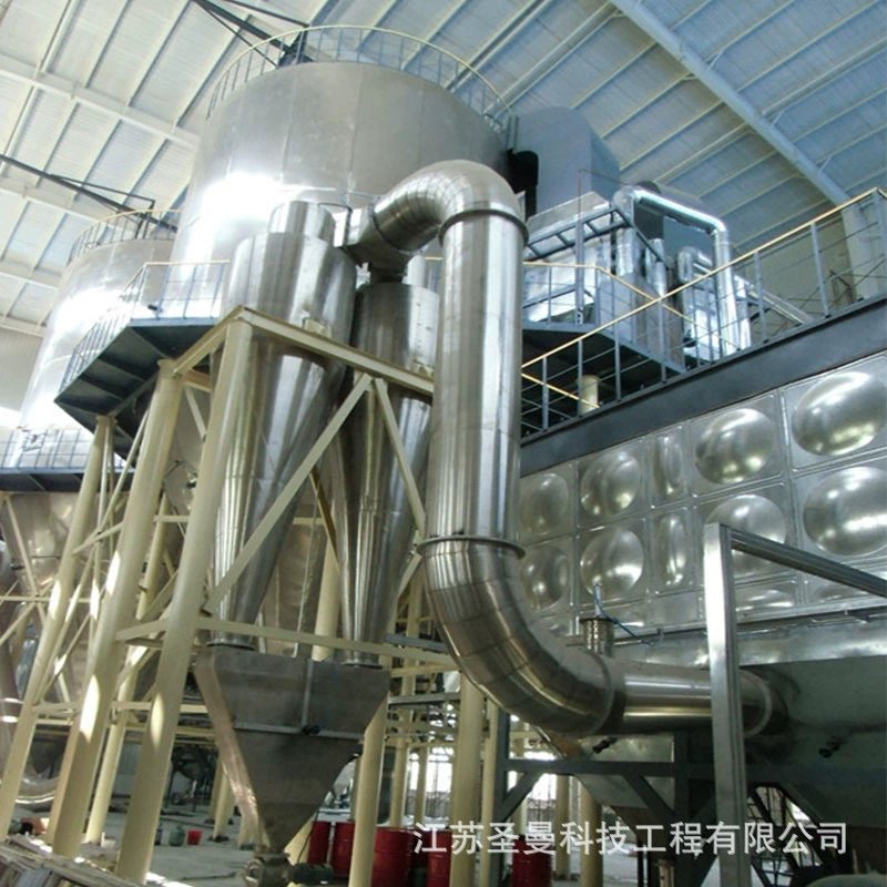 一种脱硫废水高效喷雾干燥系统,该脱硫废水高效喷雾干燥系统包括浆液输送管道、浆液输送泵、高压连接管道、喷雾干燥塔、烟道和负压输送干粉管道,浆液输送管道两端分别与外部脱硫废水浓缩液和浆液输送泵进液口连接,浆液输送泵出液口通过高压连接管道和喷雾干燥塔进料口连通,喷雾干燥塔出料口通过负压输送干粉管道和除尘器连接,喷雾干燥塔进气口通过烟道和外部热烟气连接;喷雾干燥塔上分别安装有特制喷枪和热风分布器,热风分布器位于特制喷枪上部,热风分布器包括整流板、导流板一和导流板二,整流板均位于导流板一和导流板二上部,热风分布器和烟道连通,特制喷枪和浆液输送泵输送的脱硫废水浓缩液连通,烟道位于整流板上部,整流板例如焊接在喷雾干燥塔上端面,烟道和整流板连通,然后烟道经过整流板后,依次经过导流板一和导流板二后,进入喷雾干燥塔内部;特制喷枪包括旋片和喷嘴,旋片内嵌到喷嘴内部,旋片包括液体切线入口和旋转室,液体切线入口喷入外部脱硫废水浓缩液,特制喷枪由旋片、喷嘴和枪体三部分组成,枪体安装在喷雾干燥塔内部,枪体顶端螺纹连接有喷嘴,旋片内嵌到喷嘴内部,旋片由液体切线入口和旋转室组成,外部脱硫废水浓缩液喷入枪体,然后脱硫废水浓缩液通过旋片的液体切线入口进入后,进入旋转室,脱硫废水浓缩液在旋转室获得旋转动能,根据旋转动量矩守恒定律,旋转速度在轴心速度大,因此在喷嘴中央形成一股压力等于大气压的空气旋流,液体形成绕空气心旋转的环形薄膜,液体静压能转变为向前运行的液膜的动能,从喷嘴高速喷出,其中例如可以为高压连接管道贯穿喷雾干燥塔,并且高压连接管道进入喷雾干燥塔部分和枪体一端连通。