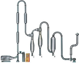 原理:具有分散作用的风机,特别适合热敏物料的气流干燥作业。高速飞旋的风机叶轮,能把湿的、甚至结块的物料解碎,直至分散,在分散过程中同时搅拌、混和,然后物料和热气流平行地流动。这种类型的设备,适应干燥滤饼结块的,但还属于表面水份的物料,含湿量≤40%,如果处理量大或者成品要求干至15%以下时,可采用二级气流干燥。当物料含湿量超过40%,但≤60%时,进料较困难,应采用混料器,通过混进干料的方法以降低进料水份,此时,干燥设备的总产量就有较大幅度的下降,这在经济上是不合算的。因此,用户应先用机械的方法(离心脱水或压滤)尽可能的降低进料水份,以确保干燥作业的顺利进行。