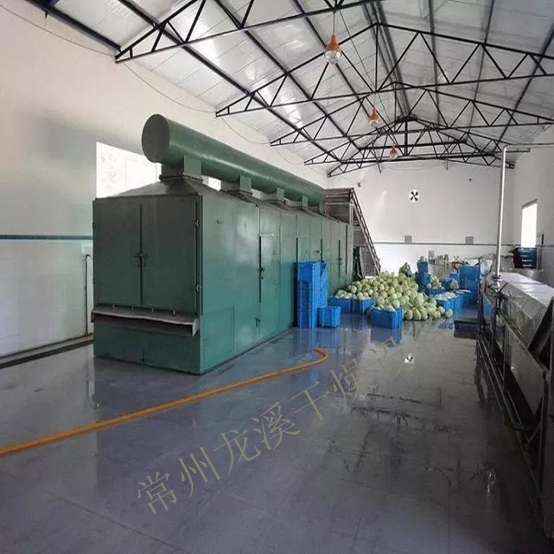 物料由加料器均匀地铺在网带上,网带采用12-60目不锈钢丝网。由传动装置拖动在干燥机内移动。干燥机由若干单元组成,每一单元热风独立循环,部分尾气由专门排湿风机排出,废气由调节阀控制,热气由下往上或由上往下穿过铺在网带上的物料,加热干燥并带走水分。网带缓慢移动,运行速度可根据物料温度自由调节,干燥后的成品连续落入收料器中。上下循环单元根据用户需要可灵活配备,单元数量可根据需要选取。