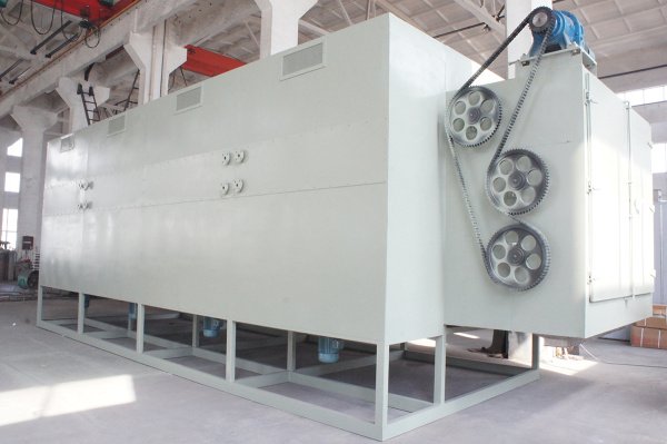 物料由加料器均匀地铺在网带上,网带一般采用12-60目不锈钢丝网,由传动装置拖动在干燥机内移动。干燥机由若干单元组成,每一单元热风独立循环,部分尾气由专门排湿风机排出,废气由调节阀控制,热气由下往上或由上往下穿过铺满物料的网带完成热量与质量传递的进程,带走物料水份。网带缓慢移动,运行速度可根据物料温度自由调节,干燥后的成品连续落入收料器中。上下循环单元根据用户需要可灵活配备,单元数量亦可根据需要选取。
