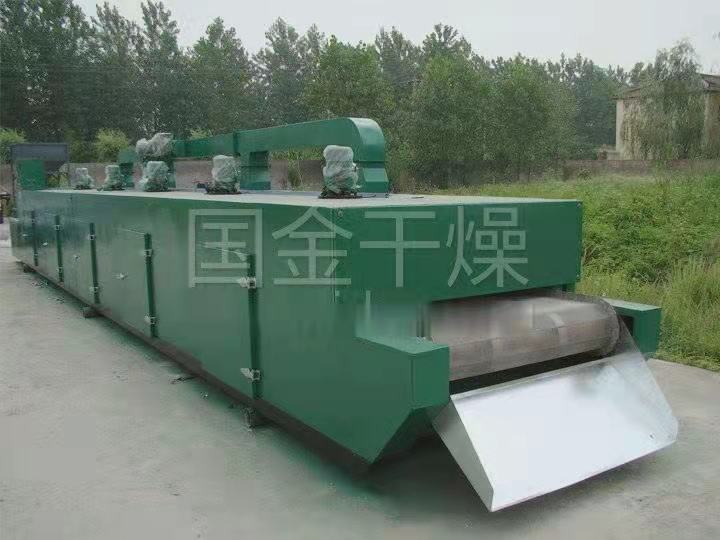 物料由加料器均匀地铺在网带上,网带一般采用12-60目不锈钢丝网,由传动装置拖动在干燥机内移动。干燥机由若干单元组成,每一单元热风独立循环,部分尾气由专门排湿风机排出,废气由调节阀控制,热气由下往上或由上往下穿过铺满物料的网带完成热量与质量传递的进程,带走物料水份。网带缓慢移动,运行速度可根据物料温度自由调节,干燥后的成品连续落入收料器中。上下循环单元根据用户需要可灵活配备,单元数量亦可根据需要选取。