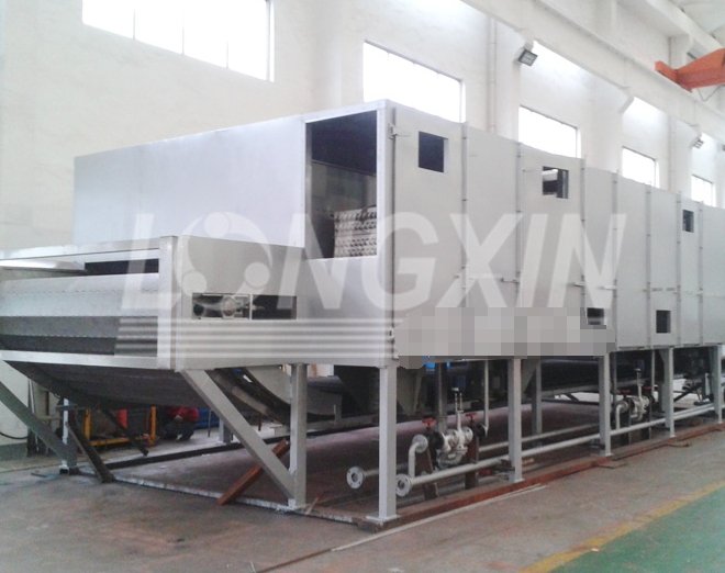 此款带式干燥机是我公司在常规的带式干燥机的基础上进行的改进,主要结构特点是将换热器放置于网带上下位置,热风循环方式为纵向多单元串联循环,具有加热均匀,热利用率高的优点。可用于透气性较好的片状、条状、颗粒状和部分膏状物料的干燥。对于脱水蔬菜、中药饮片等含水率高、无细小粉粒产生的物料具有干燥速度快、蒸发强度高、产品质量好等优点。