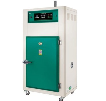 将需烘千的物料放入活动料盘中,当接通电源运行时,强力风轮启动迫使由进风口进入的空气吹向电热管,空气经过电热管加热升温,并穿过带孔的隔墙,均吹向物料,携带了水份的空气将由顶部的排湿风机抽出烤箱之外。
