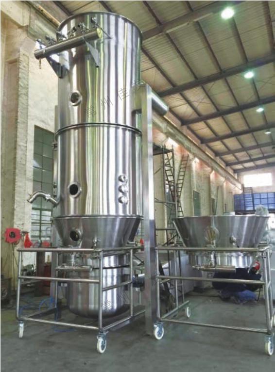 ★旋流流化床制粒包衣机是将流化床做成叶片式结构的流化床,并使叶片呈一定斜度,让气流从叶片的间隙通过,形成环流状的强大气流,使物料呈旋涡状似的有序运动,同时安装在侧壁的气动喷嘴将粘合剂或包衣液喷入呈旋涡状的物料层,从而将粉体制成颗粒或获得连续均匀的衣膜。