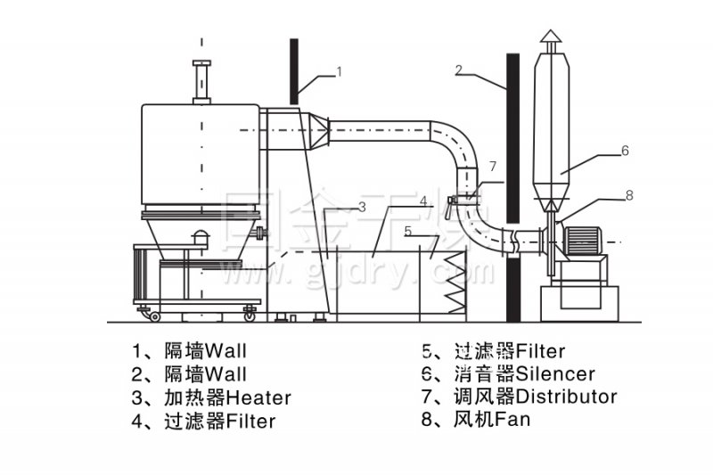 空气经加热净化后,由引风机从下部导入,穿过料斗的孔网板。在工作室内,经搅拌和负压作用形成流态化,水份快速蒸发后随着排气带走,物料快速干燥。