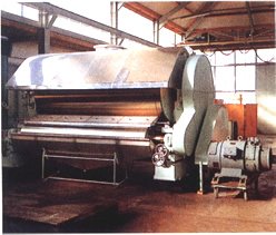 滚筒干燥机是一种内加热传导型转动连续干燥设备。旋转的滚筒通过其下部料槽,粘附着一厚度的料膜,热量通过管道输送至滚筒内壁,传导到滚筒外壁,再传导给料膜,使料膜中的湿得到蒸发、脱湿、使含温分的物料得到干燥。干燥好的物料被装置在滚筒表面的刮必铲离滚筒,到置于刮必下方的螺旋输送器,通过螺旋输送器再将干物料集中、包装。