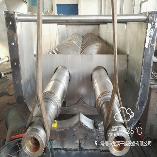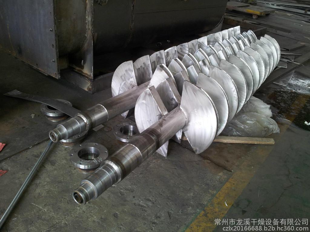 空心轴上密集排列着楔型中空桨叶,热介质经空心轴流经桨叶。单位有效容积内传热面积很大,热介质温度从-40℃到320℃,可以是水蒸汽,也可以是液体型:如热水、导热油等。间接传导加热,没有携带空气带走热量,热量均用来加热物料。热量损失仅为通过器体保温层向环境的散热。楔型 桨叶传热面具有自清洁功能。物料颗粒与楔型面的相对运动产生洗刷作用,能够洗刷掉楔型面上附着物料,使运转中一直保持着清洁的传热面。桨叶干燥机的壳体为W型,壳体内一般安排二到四根空心搅拌轴。壳体有密封端盖与上盖,防止物料粉尘外泄及收集物料溶剂蒸汽。出料口处设置一挡扳,保证料位高度,使传热面被物料覆盖而充分发挥作用。热介质通过旋转接头,流经壳体夹套及空心搅拌轴,空心搅拌轴依据热介质的类型而具有不同的内部结构,以保证**的传热效果。
