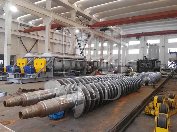 空心轴上密集排列着楔型中空浆叶,热介质经空心轴流经浆叶。单位有效容积内传热面积很大,热介质温度从-40℃到320℃,可以是水蒸汽,也可以是液体型:如热水、导热油等。间接传导加热,没有携带空气带走热量,热量均用来加热物料。热量损失仅为通过器体保温层向环境的散热。楔型浆叶传热面具有自清洁功能。物料颗粒与楔型面的相对运动产生洗刷作用,能够洗刷掉楔型面上附着物料,使运转中一直保持着清洁的传热面。浆叶干燥机的壳体为Ω型,壳体内一般安排二到四根空心搅拌轴。壳体有密封端盖与上盖,防止物料粉尘外泄而充分发挥作用。