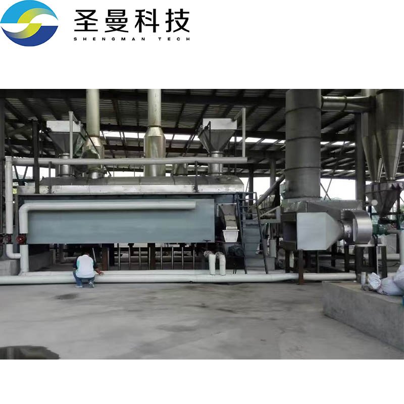 蛋白渣烘干工艺:由于物料初水份较高,根据工艺客 户自身把水份由80%深度脱水至<65%,再进入双桨叶干燥机把物料水份从65%干化至15%后出料,经螺旋输送(带冷却)后的物料由斗式提升机输送至二 楼振动筛,筛分后的成品直接进入成品干料仓,底部吨袋包装机可直接包装。筛分下的粗颗粒经粉碎机破碎后再次输送进入干燥机进行烘干。