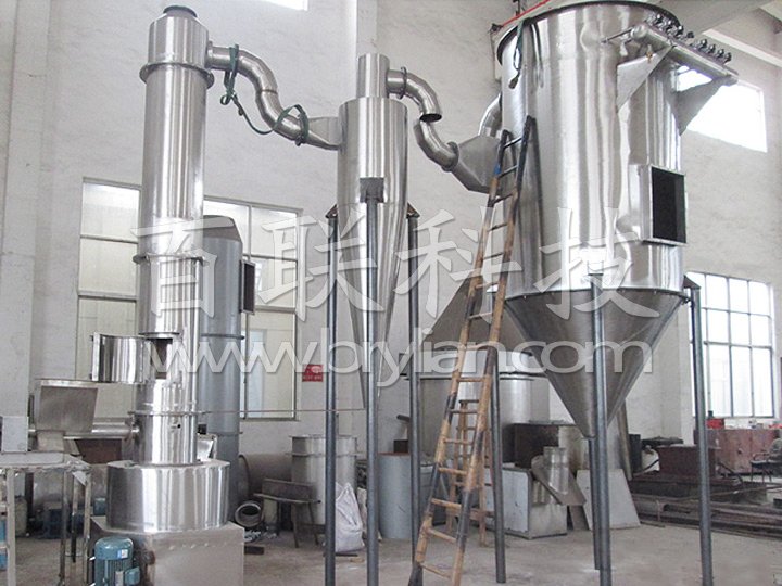 热空气切线进入干燥器底部,在搅拌器带动下形成强有力的旋转风场。膏状物料由螺旋加料器进入干燥器内,在高速旋转搅拌桨的强烈作用下,物料受撞击、磨擦及剪切力的作用下得到分散,块状物料迅速粉碎,与热空气充分接触、受热、干燥。脱水后的干物料随热气流上升,分级环将大颗粒截留,小颗粒从环中心排出干燥器外,由旋风分离器和除尘器回收,未干透或大块物料受离心力作用甩向器壁,重新落到底部被粉碎干燥。