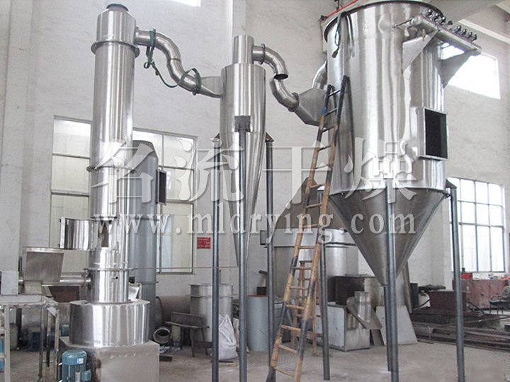 热空气切线进入干燥器底部,在搅拌器带动下形成强有力的旋转风场。膏状物料由螺旋加料器进入干燥器内,在高速旋转搅拌桨的强烈作用下,物料受撞击、磨擦及剪切力的作用下得到分散,块状物料迅速粉碎,与热空气充分接触、受热、干燥。脱水后的干物料随热气流上升,分级环将大颗粒截留,小颗粒从环中心排出干燥器外,由旋风分离器和除尘器回收,未干透或大块物料受离心力作用甩向器壁,重新落到底部被粉碎干燥。