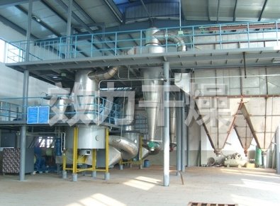 热空气切线进入干燥器底部,在搅拌器带动下形成强有力的旋转风场。膏状物料由螺旋加料器进入干燥器内,在高速旋转搅拌桨的强烈作用下,物料受撞击、磨擦及剪切力的作用下得到分散,块状物料迅速粉碎,与热空气充分接触、受热、干燥。脱水后的干物料随热气流上升,分级环将大颗粒截留,小颗粒从环中心排出干燥器外,由旋风分离器和除尘器回收,未干透或大块物料受离心力作用甩向器壁,重新落到底部被粉碎干燥。