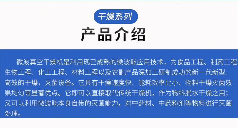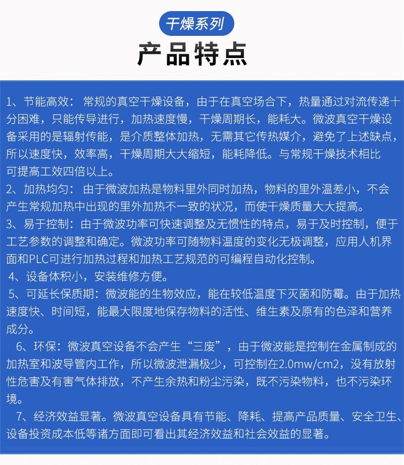 微波真空干燥机是利用现已成熟的微波能应用技术,为食品工程、制药工程、生物工程、化工工程、材料工程以及农副产品深加工研制成功的新一代新型、高效的干燥,灭菌设备。它具有干燥速度快、能耗效率比小、物料干燥灭菌效果均匀等显著优点。它即可以直接取代传统干燥机,作为物料脱水干燥之用;又可以利用微波能本身自带的灭菌能力,对中药材、中药粉剂等物料进行灭菌处理。主要应用于高附加值、且具有热敏性的农副产品、保健品、食品、药材、果蔬、化工原料等的脱水干燥、杀菌;用于化工产品的低温浓缩、结晶水的脱除、酶制剂的干燥等,微波真空干燥机适用于科研院校的实验室。