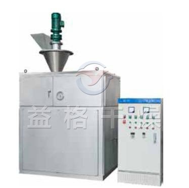 粉状物料由振动给料斗经横向螺旋送料器定量,均匀地加人轧片主料斗,使轧片主料斗内保持恒定的料粒,然后由轧片主料内的纵向锥螺旋对粉料进行预压缩并输送到两只压辊的弧形槽口,两只压辊表面均匀分布形状相同的半扁圆形弧槽或菱形槽,通过一对齿轮的啮合传动,使两只压辊等速,反向旋转,将锥螺旋输送至槽口的物料咬入槽内并瞬间强制压缩,物料经过压缩后随着压力逐渐减小在其弹力及重力作用下,从槽内脱落,进入破碎整粒系统,然后根据用户的粒度要求过筛、分级,得到符合质量要求的均匀颗粒状产品,筛下粉重新返回振动料斗循环利用。